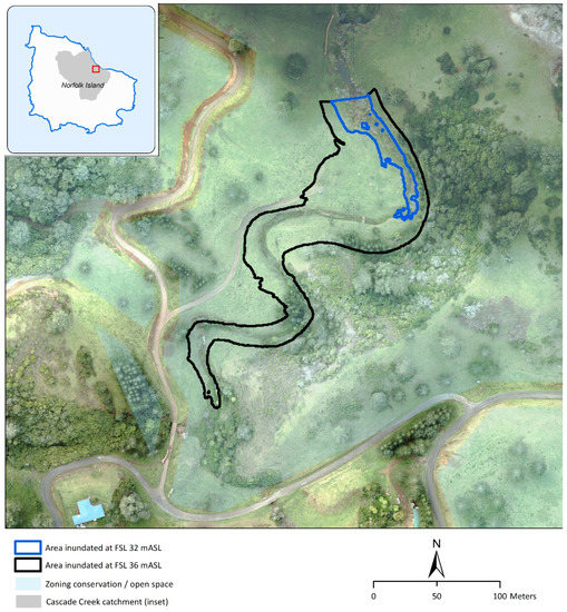 To ensure that dam sites across Norfolk Island were objectively and consistently assessed, the CSIRO DamSite model [18,19] was applied across the entire island using the LiDAR data. The model has been extensively used in Australia [20] to examine the opportunity for dams across large regions. The DamSite model comprises a series of algorithms that utilised the DEM and hydrological information to calculate the yield and cost of constructing a dam at 0.5 m height increments at each 1 m grid cell across the entire island. For the purposes of identifying farm-scale gully dams on Norfolk Island and in the absence of spatial data on runoff on Norfolk Island, the DamSite model calculated a ‘preliminary yield’ assuming runoff was a constant 20 mm/year (i.e., 2% of mean annual rainfall).