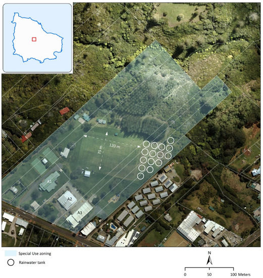 The most cost-effective and technically and socially plausible potential cluster-scale RHRWSs would be situated at the Bicentennial Oval, capturing rainwater from three large council-owned buildings (Table 2) on the southern side of the oval and storing it in tanks adjacent to the oval. The oval and adjacent land are owned by the Norfolk Island Council.