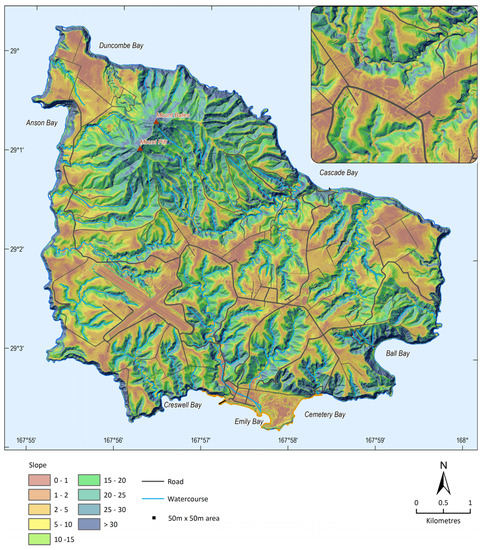 Given deep-rooted vegetation typically uses more water than shallow-rooted vegetation [26] and consequently more potential groundwater recharge typically occurs under shallow-rooted vegetation than deep-rooted vegetation [27], it is likely that the increase in deep-rooted woody vegetation on Norfolk Island over time has contributed to a decrease in groundwater recharge and consequently streamflow. As such, a course of reasoning is that replacing existing undesirable deep-rooted woody weeds and eucalyptus plantations on Norfolk Island with shallow-rooted vegetation may result in an increase in groundwater recharge. However, the removal of deep-rooted vegetation from steep slopes can accelerate erosional processes. Although no local scientific studies have been undertaken on erosional processes on Norfolk Island, the soils are very stable and well drained. When clearing woody weeds and establishing pasture on Cape York Peninsula (Queensland), the recommended slope cut-off for stable well-drained soils is 32%. For the stable basalt-derived soils of the Atherton Tablelands (Queensland), the recommended slope cut-off is 35%. Thirty-five percent is also a recommended cut-off for the challenges presented by steep slopes to the stability of machinery and consequently is the slope threshold adopted here for the clearing of vegetation and establishment of shallow rooted pastures.