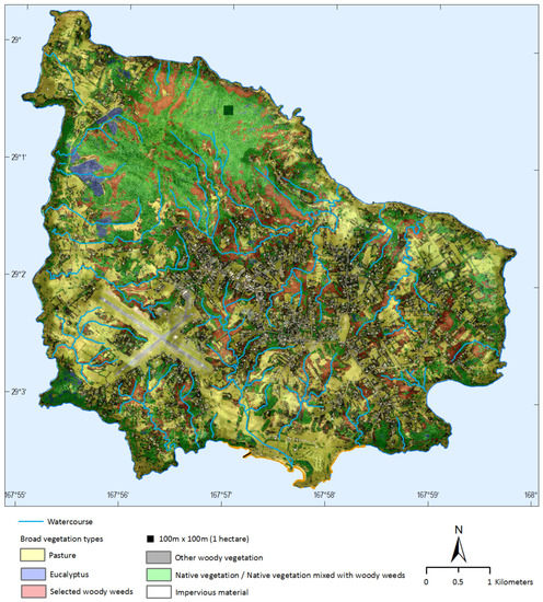 LiDAR point cloud data and aerial imagery acquired as part of this study were used to map vegetation on Norfolk Island (see [3]) (Figure 5). It was calculated that about 36% of the island is currently under shallow-rooted vegetation/pasture, 27% native vegetation or native vegetation mixed with woody weeds and 12% large contiguous areas of selected woody weeds (i.e., African olive, Cotoneaster, red guava and Hawaiian holly) (Table 3). On Norfolk Island, many of these woody weed species form dense thickets whose canopies inhibit the development of an understory.