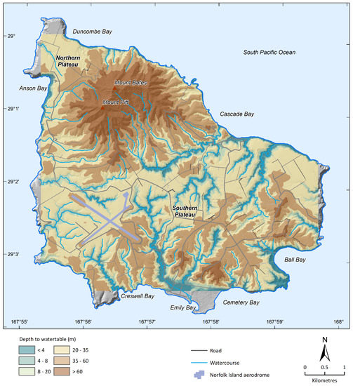Groundwater wells and bores have historically been used as a source of water on Norfolk Island when households have exhausted their roof-harvested rainwater (tank) supply and to source large quantities of water for industrial and agricultural use. However, recent challenges of extracting groundwater from the weathered volcanics during the extended dry period of the summer of 2020, coupled with the potential for the current trend of further declines in the potentiometric surface across the island, provide ongoing challenges for existing groundwater infrastructure [3]. Any additional development of groundwater to supply water during irregular, short-term ‘water emergency’ situations is better targeted to the deeper agglomerate and fractured unweathered basalt bedrock sequences deposited above present-day sea level (i.e., to avoid the potential for seawater intrusion), where seasonal and inter-annual reductions in groundwater levels exhibit smaller changes. Existing bores situated in the deeper agglomerate and fractured unweathered bedrock have a range in depth of between 76 and 154 m below ground level (median value of 88 m) [14]. The depth of the hydraulic head of the groundwater surface ranges between 14 and 113 m below ground level (median 55 m), a reflection of the high heterogeneity and variation in the degree of confinement of the groundwater system. Aquifer property data for the agglomerate units and fractured unweathered basalt on Norfolk Island are sparse, but existing indicative short-term (i.e., a few hours) pumped bore yields in the deeper agglomerate and fractured rock system were estimated to vary from 0.1 to 3.8 L/s (median of 0.7 L/s), though it should be noted that no proper pump tests have been conducted on the island. Areas considered likely to have the potential for further development of groundwater within the deeper fractured volcanic rocks/agglomerate material are near the break of slope on the southern side of Mount Pitt, where it is likely that outcropping bedrock would be directly recharged. Other areas with potential include the upper reaches of Watermill Creek, Town Creek, Rocky Point and Mission Creek, which are all recharged via vertical leakage from the weathered volcanics beneath the southern plateau.