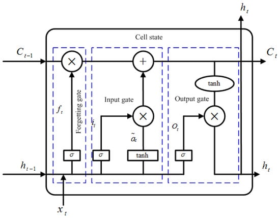 LSTM is a kind of recurrent neural network model, which has excellent time series prediction performance. The structure of LSTM unit is shown in Figure 1. Information is transmitted through a cell state (memory unit). Forgetting gate, input gate and output gate control the update of the cell state. The forgetting gate and the input gate determine the information discarded and added from the cell state, respectively, and the output gate determines the output cell state. LSTM can effectively use long-distance time series data, so it is suitable for predicting dam deformation.