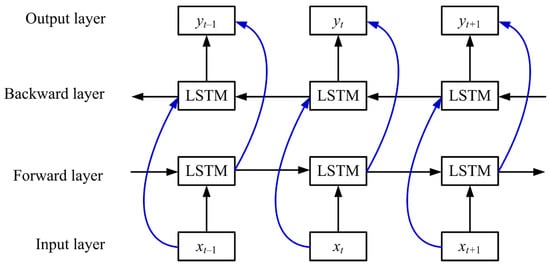 In order to contain future information, the bidirectional LSTM consists of forward and backward LSTM layers. The output layer simultaneously processes the input from the LSTM layer. and are the vectors of the backward and forward propagation layers, respectively, and is the vector of the output layer, so the update method of the neural network is as follows [12]:
