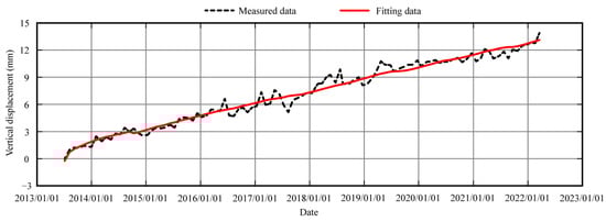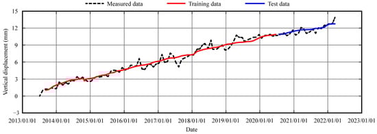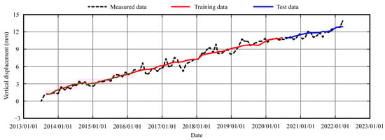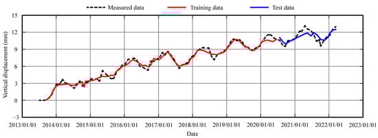 The Danjiangkou hydropower station is composed of a dam, power plant, ship lift and water diversion project. The total length of the dam is 3442 m, the riverbed is a concrete dam and the two banks are earth rock dams. The earth rock dam on the right bank is a clay core dam with a dam length of 877 m and a maximum dam height of 60 m. The earth rock dam on the left bank is a clay inclined wall and clay core dam, with a dam length of 1424 m and a maximum dam height of 70.6 m. According to the settlement monitoring data of measuring point LD12ZT01 on the left bank (dam crest 0 + 648) and measuring point LD16YT01 on the right bank (dam crest 0 + 658) from July 2013 to March 2022, the settlement prediction models of the two measuring points are established. The positive value is assumed as settlement.