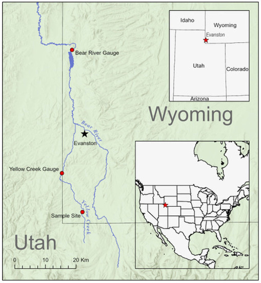 Map of study site and stream gauge locations. Insets and red star illustrate general location of study site in North America. Yellow Creek and the Bear River both originate in the Uinta Mountains of northern Utah and flow northward before their confluence near Evanston, Wyoming, USA (black star). Red dots indicate the sample site and the location of the Yellow Creek Gauge and the Bear River Gauge referenced in Figure 2.