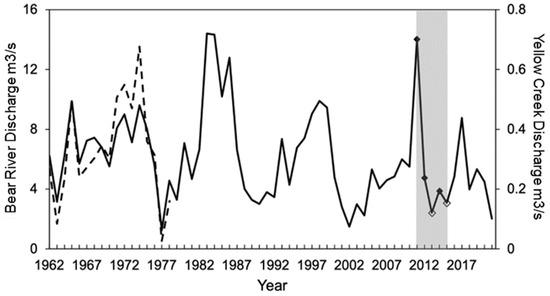 Average daily discharge data for both Yellow Creek and the Bear River. Comparison of the data shows the association between the flow of both systems. No data were available for Yellow Creek within the years of our study; thus, the Bear River is used as proxy. Yellow Creek is represented by the dashed line and the Bear River by the solid line. Years with perennial flow are marked with a solid diamond and years with intermittent flow are marked by an open diamond. Scale for Yellow Creek is represented on the right and the Bear River on the left. Years within our study are highlighted with a gray background. Yellow Creek Gauge: USGS 10017000. Bear River Gauge: USGS 10020300. While Yellow Creek flow patterns have been quite variable, this stream has had perennial (year-round) flow over the past few decades (personal communication, Kyle Lowham); intermittence is a new phenomenon that occurred in 2013 and 2015 in the study section.
