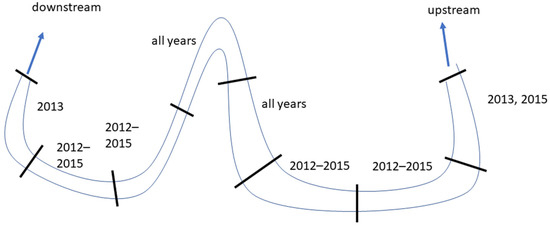 Stylized representation of the stream with sampling segments indicated by solid black lines. Each segment was 100 m in length and the width of the stream varied from two to five meters. Years that each segment was sampled are listed adjacent to the segment. The two segments in the middle labeled as “all years” represent the two original 100 m segments sampled first in 2011 and all years thereafter for the duration of the study. Additional segments were included in the two years with intermittent flow because some parts of all segments were dry.