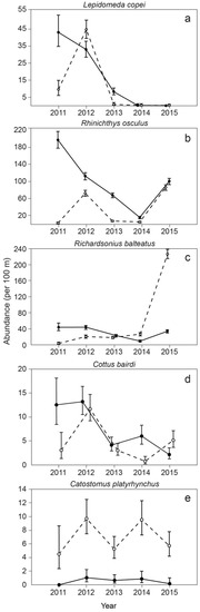 Mean fish abundances by species per year for the five species in this study (a–e). Error bars are 95% confidence intervals of the mean. Adults are represented by the solid line and solid circles, and juveniles are represented by the dashed line and open circles.