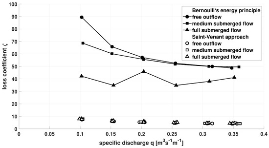 The loss coefficients were determined by evaluating the measurement data from this study with Bernoulli’s energy principle (Equation (6)). The loss coefficient is highly affected by the backwater situation and depends on the flow velocity. Furthermore, Bernoulli’s energy principle overestimates the more reliable results from the Saint-Venant approach (Section 4).