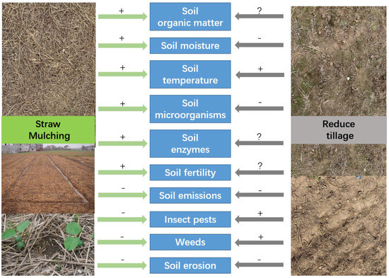 Effects of straw mulching and reduced tillage on the soil environment. The + sign showed a positive effect, the − sign showed the negative effect, and ? indicate the undefined effect.