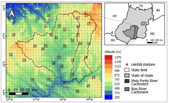 The study area encompasses the Meia Ponte River catchment, located in the central region of the Brazilian state of Goiás, and the Bois River catchment, located at the southern portion of the state (Figure 1). The Meia Ponte River catchment drains an area of 14,819 km2, amounting to approximately 3.6% of the territory of Goiás. It is a densely populated region, with about inhabitants concentrated in the municipalities of Goiânia, Aparecida de Goiânia, Anápolis, Senador Canedo and Itumbiara. The catchment is characterized by a tropical savanna climate, with a dry season spanning from April to September and a wet season between October and March. The temperature ranges from 17 °C to 31 °C, whilst the mean annual rainfall varies from 1400 to 1600 mm [39].