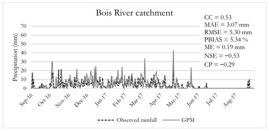 For the Bois River catchment, the overall tendency of overestimation is even more pronounced, with higher values for the ME and PBIAS, as compared to the Meia Ponte data set. Moreover, a poorer representation of the temporal dynamics of the observed rainfall is perceived, with some lag between GPM retrievals and observed events throughout most of the period of record. Finally, the distinctions among the RMSE and MAE values are also noticeable, suggesting an unsuitable description of rainfall extremes by the satellite retrieval; additionally, both benchmarks are negative, indicating that the mean and/or the previous day’s observed precipitation are preferable for prediction. On the other hand, the dry season was reasonably described in both catchments, which suggests at least for the study area that the GPM product is sufficiently accurate for detecting non-rainfall events. We note, however, that this is a poorly gauged catchment, in which many of the rainfall gauging stations are located in areas with more complex terrain and stronger topographic gradients (Figure 1). At least to some extent, this fact may explain the poorer performance of the IMERG-GPM product in the Bois River catchment. In effect, it is well established that most satellite products are unable to properly reproduce rainfall regimes in regions with complex topographies [6].