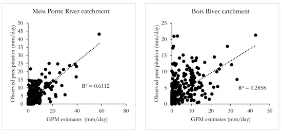 Figure 4 depicts scatterplots for the GPM precipitation estimates and the observed rainfall amounts. For the Meia Ponte River catchment (left panel), a linear functional form may be visualized, despite the large dispersion of the errors for precipitation amounts larger than 10 mm, which entailed a value of 0.61 for the coefficient of determination , and some degree of deviation from the 1:1 line. For the Bois River catchment (right panel), on the other hand, the linear association is much weaker with , which indicates that the satellite retrievals are unable to explain the variation in the observed rainfall in this area.