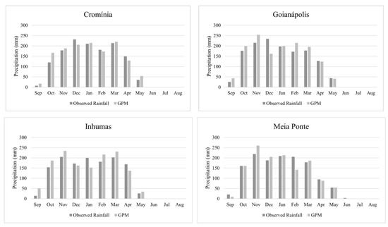 After the data quality check and the filling of missing data, four gauging stations which presented anomalous behaviors with respect to the mean annual rainfall (values less than 1000 mm) were discarded. The gauges that were retained for analyses are shown in Table 1. Finally, for assessing the performance of the GPM precipitation product, whose data are available from 2014 onwards, the daily rainfall amounts recorded in the water year of September 2016–August 2017 were utilized. We note that this decision resulted from the large amount of missing data prior to 2016 and from 2017 onwards in most of the rainfall gauging stations utilized in our study; this could introduce high levels of bias in the comparison. On the other hand, 2017 presented an annual rainfall amount relatively close to the long-term average (1339 mm and 1500 mm, respectively, for the Meia Ponte River catchment), which may, at least to some extent, attenuate the effects of low data availability in subsequent analyses.