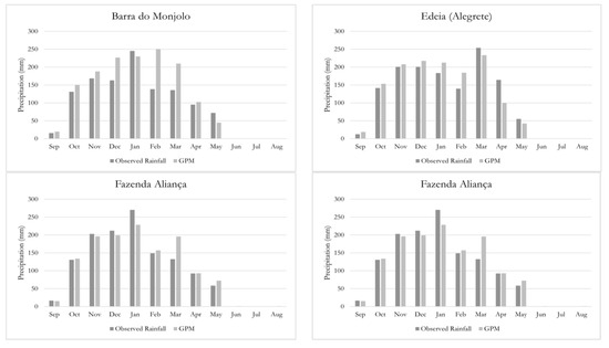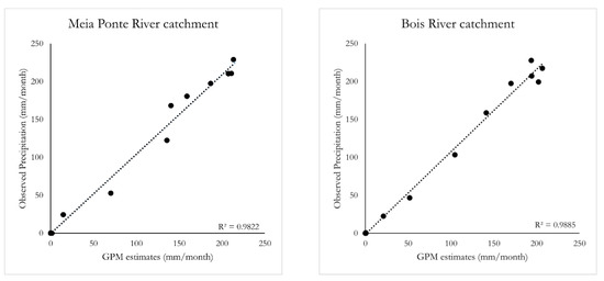 On the other hand, when precipitation amounts are averaged over the entire areas of the catchments, the performance of the GPM product is suitable and similar for both geographical regions. In fact, as depicted in Figure 7, the satellite retrievals present good agreement with spatialized gauge data for all months, and are able to explain 98% (left panel) and 99% (right panel) of the latter’s variability for the Meia Ponte and the Bois River catchments, respectively. In other words, the averaging procedure across large extensions smoothed out the larger variations in particular locations of the catchment that were verified in the previous analyses, hence improving GPM performance overall.