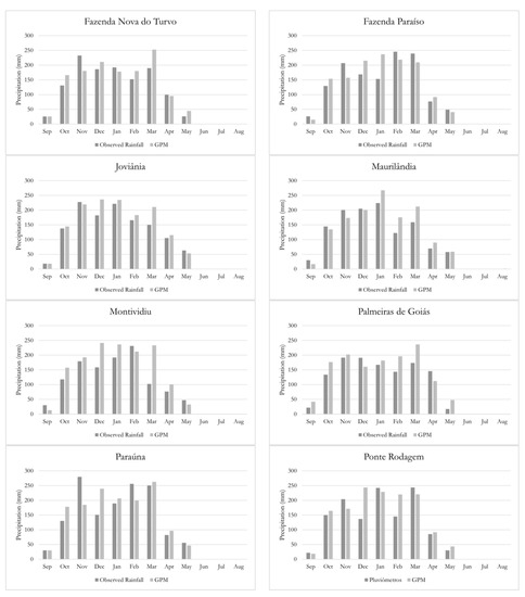 Inspection of Table 4, in turn, indicates a much larger variation in the values of the goodness-of-fit metrics, and an overall worse performance with respect to the interpolated rainfall in the Bois River catchment. In effect, whilst most values of the CCs ranged from 0.39 to 0.50, suggesting a poorer description of the temporal dynamics of the observed rainfall, the values of RMSE surpass, in many cases, more than 20% of those in the Meia Ponte catchment. High levels of variation are also verified for the PBIAS, and the tendency of overestimation is much stronger in the Bois River catchment—in some cases, systematic errors larger than 15% were verified. Of course, this may have stemmed from the inaccurate spatialization of the observed rainfalls in some portions of the catchment, as well as from the locations of the rainfall gauging stations in areas with complex terrain. However, our results suggest that the GPM product was unable to retrieve the real evolution of the daily precipitation activities across this entire region, and this certainly calls for further investigation in regard to potential causes of this phenomenon.