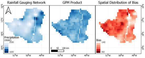 As a final remark, we note that previous research demonstrated that the GPM product has suitable abilities in describing spatial precipitation patterns, but the rainfall intensities and spatial variability, which are closely linked to seasonality, have some influence on the capability of the GPM retrievals to capture local precipitation patterns [48]. Our results are at least to some extent in agreement with these conclusions. In fact, in many situations, the spatial distribution of rainfall was not properly described by the IMERG satellite retrievals, with a tendency of generating smoother surfaces as compared to the data captured by ground-based information. Nonetheless, as may be inferred from Melo et al., 2015, and Moraes and Gonçalves, 2021 [29,35], the IMERG-GPM may be a preferable alternative for our study region after spatial averaging, as it more properly described the rainfall amounts on a daily time scale. Hence, despite the inaccurate descriptions of daily rainfall extremes, which are not considerably improved under bias correction [6], the short size of our sample, and the relatively poor representation of spatial patterns, we still believe that the IMERG-GPM product may be a useful data source for the Brazilian midwestern region, as compared to well-established alternatives such as TRMM, mainly for continuous rainfall–runoff simulation based on a daily time step, and drought management, which requires data at monthly or longer time scales.