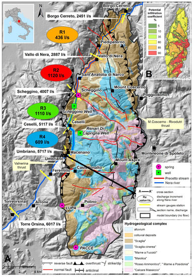 (A): Hydrogeological setting, conceptual model. (B): distribution map of the potential infiltration coefficients. Tectonic elements (faults, thrust, anticlinal axis) from [40].