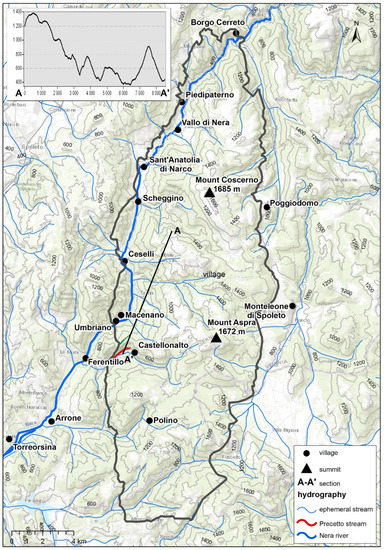 - Damiani, A.V.; Baldanza, A.; Barchi, M.R.; Boscherini, A.; Checcucci, R.; Decandia, F.A.; Felicioni, G.; Lemmi, M.; Luchetti, L.; Motti, A.; et al. Geological Map of Italy. Scale 1:50,000. Scheet 563 “Spoleto”; ISPRA-Servizio Geologico Nazionale: Roma, Italy, 2008. [Google Scholar]