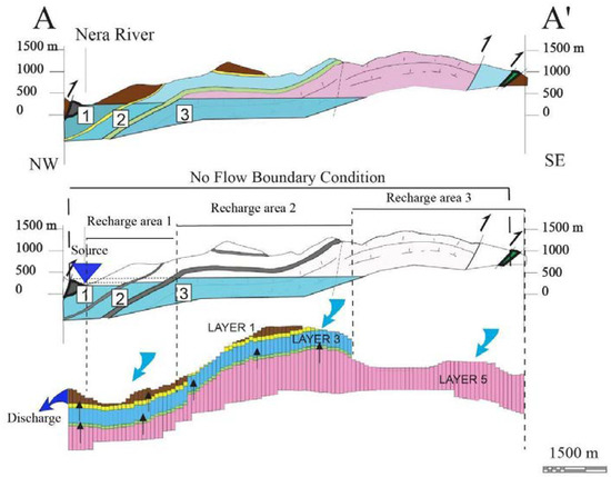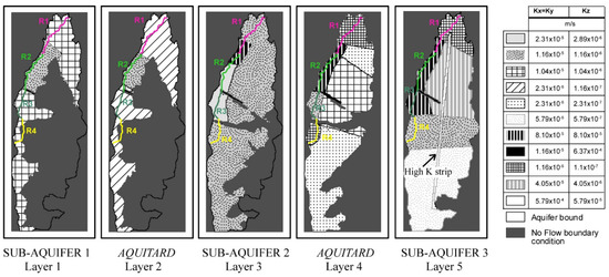 Indeed, the use of five layers allows for a very detailed setting of the distribution of K zones which, once calibrated, should reflect a possible pattern of permeability values, making the model results consistent with the observed discharge rates and heads. Previous runs, performed with relatively high K strips in the sub-aquifers three and five, e.g., the NW–SE faults cutting the structure near Scheggino (see Figure 1 and Figure 6), were unable to drive the fluxes toward the northern part of the structure. Finally, the insertion of the high conductivity strip in the sub-aquifer three (Figure 6) ameliorated by far the calibration of the fully 3D model. Thus, the high hydraulic conductivity zones in a generalized and simplified view of the geological setting are likely to reflect fractures or faults zones. Tectonics also drive the vertical exchanges among the sub-aquifers through the aquitards. A better match was achieved considering zones of relatively high vertical permeability within the aquitards, simulating highly tectonized zones or stratigraphic gaps, for example in correspondence of reach R2 (Figure 6), which allows the groundwater to flow vertically upward from layer five to the upper layers.