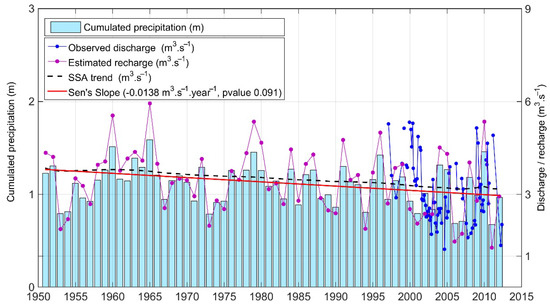 Estimated recharge to the aquifer (purple graph), with respect to the cumulated precipitation (histogram) and the observed aquifer discharge (blue graph). Trend (black dashed line) and Sen’s slope refer to the calculated recharge.