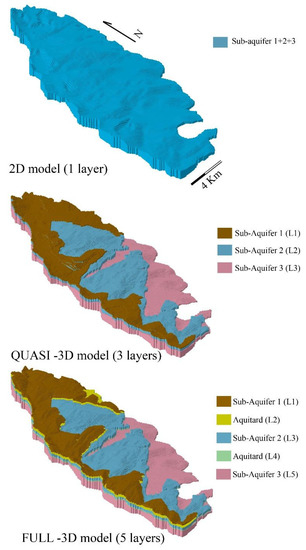 An important advantage of quasi-3D and fully 3D models with respect to the 2D model is that the slope and dipping of single layers can be correctly reproduced, allowing flow to be reliably simulated along the layers. In addition, the quasi-3D and fully 3D models are able to represent localized areas of preferential upward flow with a nonuniform vertical leakage array or by adding high vertical permeability zones to simulate discontinuities in the aquitards, respectively.
