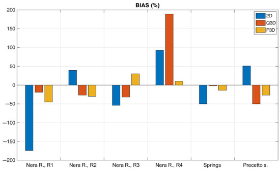 However, high hydraulic conductivity zones alone were not sufficient to maintain the hydraulic gradients steep enough to feed the most upgradient reach R1. The groundwater mostly flows in the sub-aquifer three. Despite a prevalent diffuse circulation (which justifies the EPM approach), the high hydraulic conductivity strip along the anticline axis that facilitates the groundwater to flow from south to north is consistent with a discrete groundwater circulation pattern. This was confirmed by observation during the perforation of the Renari well for the Calcare Massiccio aquifer, which showed a prevalent circulation through fractures. Table 5 lists the results of the three models after calibration. Figure 7 shows the bias %.
