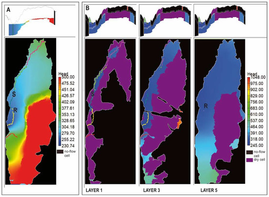 Simulated head for the 2D model (A) and for the layers 1, 3 and 5 in the fully 3D model (B). Model cross sections at the top of figures (row 162, column 23). Approximate locations of Scheggino well (S) and Renari well (R) are shown.