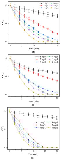 As shown in Figure 5, the degradation efficiency of SDZ increased with the increase in ozone concentration. When the ozone concentration was 1 mg/L, O3, O3/UV, and O3/PMS degradation rates in 20 min were 30%, 40.6%, and 19.1%, respectively. When the ozone concentration increased to 6 mg/L, O3 and O3/UV degraded SDZ below the detection limit in 12 min, while it took only 10 min to degrade SDZ below the detection limit in the O3/PMS system. The 20 min degradation efficiency of O3/PMS was lower than that of O3 and O3/UV (when the O3 concentration was 1 mg/L) because the ozone concentration was too low. In O3/PMS, firstly, enough ozone was needed to oxidize and activate PMS. When the initial O3 concentration was low, this process consumed O3, so there was not enough O3 to participate in the subsequent degradation process of SDZ. With the increase in ozone dosage, the degradation efficiency of the three processes was significantly improved because the more significant the ozone dosage, the stronger the promotion of free radicals. From the comparison of Kobs values corresponding to O3 dosage from 2 mg/L to 6 mg/L in the three processes, it can be seen that the reaction rate of O3/PMS increased with the increase in ozone dosage, and the reaction rate of each dosage was greater than that of O3 and O3/UV under the same conditions.