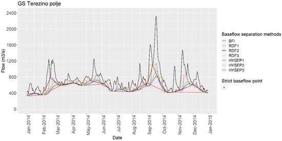 Example of the applied baseflow separation methods and strict baseflow points at gauging station Terezino polje on the Drava River for the year 2014.