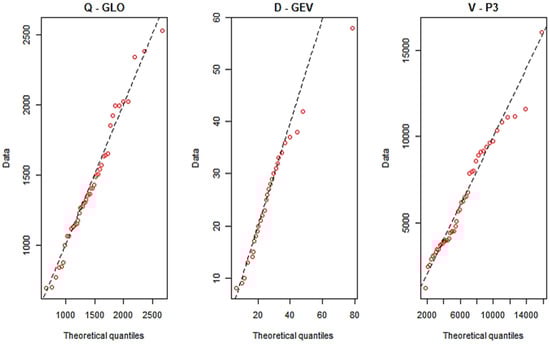 By defining the three variables describing the flood event (Q, V, D), a univariate frequency analysis was conducted by fitting marginal probability distributions to each variable separately. Several studies have been conducted with the aim to find the best-modelled families of univariate distributions, with some recommending parametric distributions [,,,], while others select different families (e.g., nonparametric distributions) [,]. In order to determine the best-fitting univariate distribution for Q, V and D, six parametric distributions were fitted and compared in the scope of this study: Gumbel (GUM), Pearson 3 (P3), generalized extreme value (GEV), generalized logistics (GLO), log-normal (LN), and log-Pearson 3 (LP3). Parametric distribution function parameters were estimated with the method of L-moments []. The best-fitting distribution function for each variable was evaluated based on graphical Q-Q plots and the statistical Anderson–Darling (AD) test, which is included in the R package “ADGof” [].