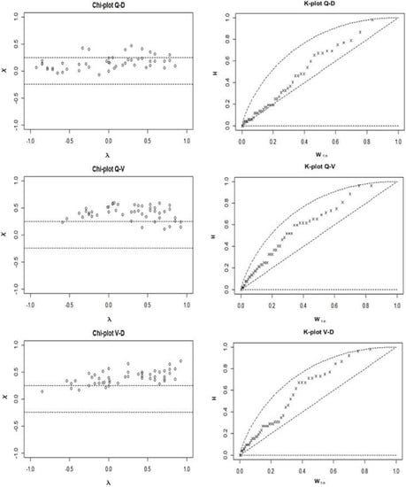 - Fisher, N.I.; Switzer, P. Chi-Plots for Assessing Dependence. Biometrika 1985, 72, 253–265. [Google Scholar] [CrossRef]