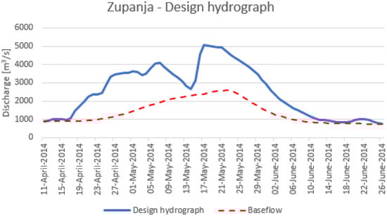 Duration of the flood hydrograph events is defined as the number of days between the starting and ending days of the observed flood event. In order to define the duration of the flood event, one must choose between a specific threshold method and a baseflow separation technique []. In the scope of this study, we used several automated baseflow separation methods to define flood hydrograph duration and volume (Figure 2). The proposed baseflow separation methods were applied because they can be automated using the R programming language, are easily accessible, are free to obtain and operate, and are widely used in hydrological practice [,].