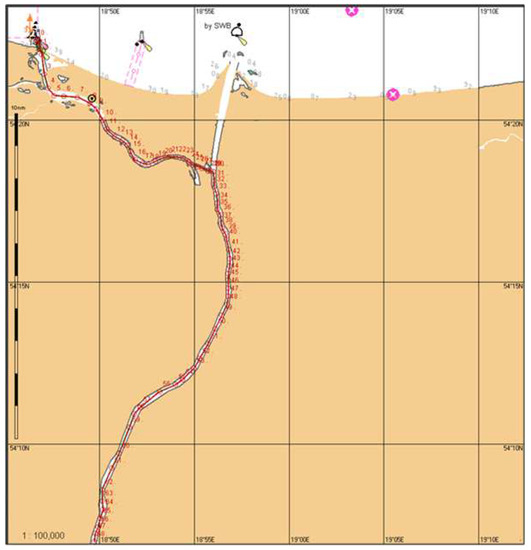 The second task, i.e., implementation of the itinerary for the inland river navigation on the stretch from the mouth of the Martwa Wisła to the dry port in Zajączkowo Tczewskie in a simulated environment, was a preliminary operational analysis. This section is not currently fully adapted to be used as a waterway. The visualization of these stretches, presented in the form of electronic map, is shown in Figure 2 and Figure 3.
