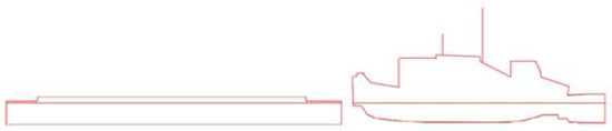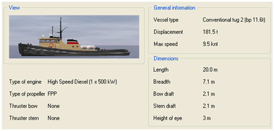 The above assumptions were compared with the parameters of all models of the vessels and barges available on the test bench [25]. From the available database, a representative model of the tugboat “Conventional tug 2” with the characteristics presented in Figure 4 was selected [26]. The parameters of the tugboat after the connection to the barge are presented in the Figure 5 and Table 1.