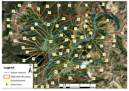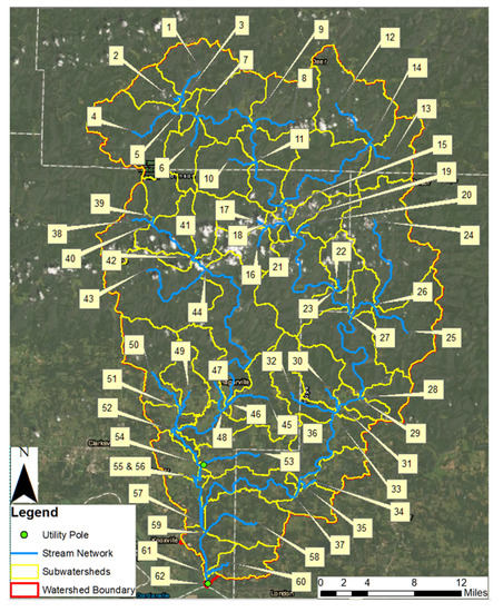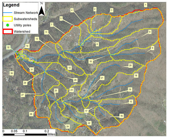 The three watersheds in this paper, Whittier, NC; Leadville, CO; and London, AR, were selected because each are located in underserved areas and contain utility poles susceptible to failure during flood events. These watersheds were delineated using U.S. Geological Survey’s (USGS) Streamstats tool and ArcGIS 10.6.1 with publicly available 10 m digital elevation models (DEMs) from USGS. The Archydro add-on for ArcGIS 10.6.1 was used to delineate subwatersheds inside each watershed.