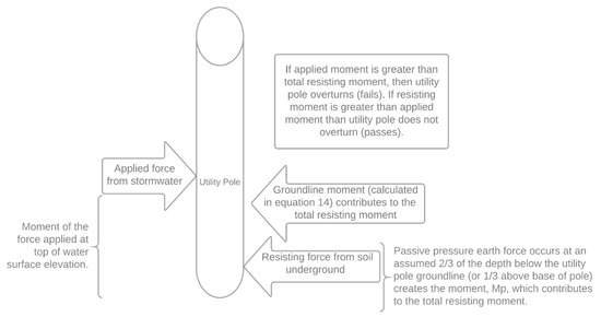 It is assumed that each utility pole in this study will be subjected to an applied moment of stormwater at a depth varying with the storm return period (WSE) and a cumulative resisting moment. This total resisting moment (Mt) is the sum of the maximum allowable moment at the utility pole groundline (Mgl) (Equation (5)) [35] and the product of the passive pressure occurring at a depth of (2/3)H (Mp).