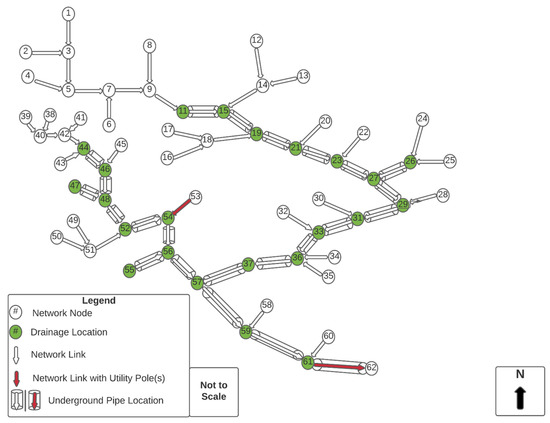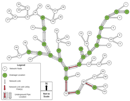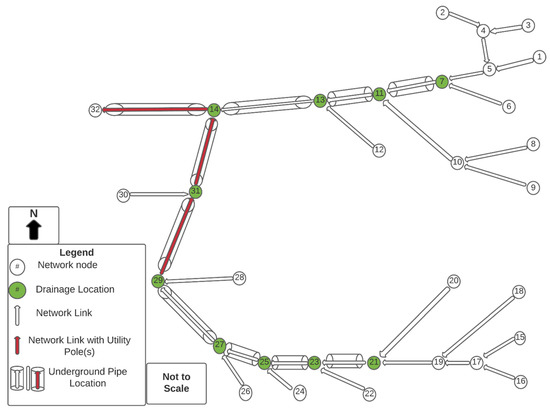 Figure 6, Figure 7 and Figure 8 were designed to be used as visual aids to interpret the data outputs in Table 4, Table 5 and Table 6, where locations of utility poles (red arrows) and underground pipe are clearly denoted. The nodes and links in Figure 6, Figure 7 and Figure 8 can also be referenced to exact locations within each watershed by using Figure 2, Figure 3 and Figure 4.