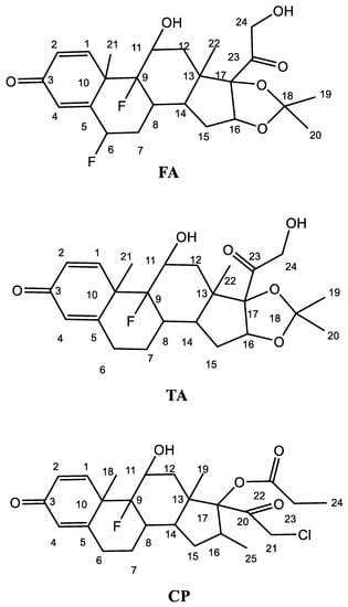 The molecular structures and atom label of fluocinolone acetonide (FA), triamcinolone acetonide (TA), and clobetasol propionate (CP).