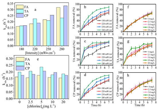 Effects of UVA light intensity (a) and chlorine dosage (e) on rate constant of FA, TA, and CP during UVA/chlorination; effects of light intensity on FA (b), TA (c), and CP (d) removal (chlorine dosage = 5 mg/L); effects of chlorine dosage on FA (f), TA (g), and CP (h) removal (light intensity = 180 mW·cm−2).
