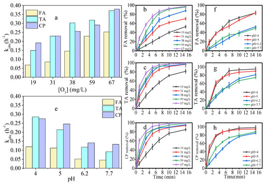 Effects of O3 dosage (a) and initial pH (e) on rate constant of FA, TA, and CP during ozonation; effects of O3 dosage on FA (b), TA (c), and CP (d) removal (initial pH = 6.2); effects of initial pH on FA (f), TA (g), and CP (h) removal (ozone dosage = 19 mg/L).