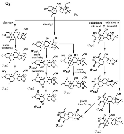 Reactions with •OH radicals were both observed during UVA/chlorination and ozonation (Figure 4). During UVA/chlorination, •OH radicals could attack the cyclohexenone double bond and generate intermediates such as FA-P470. Similarly, cyclohexenone double bond epoxidation (FA-P414 and FA-P416) and the dehydration of hydroxyl groups (FA-P436) occurred during the ozonation process (Figure 4). The intramolecular transfer of protons that removed the F atom was observed during UVA/chlorination, forming the intermediate FA-P432 (Figure 4). Similarly, intermediates such as FA-P400, FA-P382, FA-P406, and FA-P410 were detected via the intramolecular transfer of protons during ozonation [10,46].