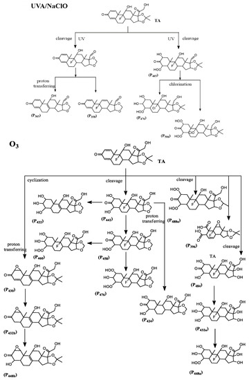 Degradation intermediates and reaction pathways of TA during UVA/chlorination (chlorine dosage = 5 mg/L, light intensity = 280 mW·cm−2) and ozonation (ozone dosage = 19 mg/L, initial pH = 4).
