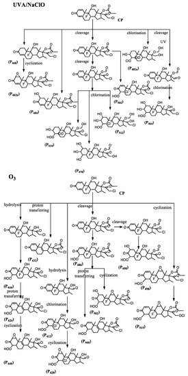 Degradation intermediates and reaction pathways of CP during UVA/chlorination (chlorine dosage = 5 mg/L, light intensity = 280 mW·cm−2) and ozonation (ozone dosage = 19 mg/L, initial pH = 4).