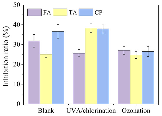 Since new intermediates were generated during UVA/chlorination and ozonation as described in Section 3.2, the toxicity changes of FA, TA, and CP during UVA/chlorination and ozonation were detected by the bacteria inhibition test. As shown in Figure 7, before UVA/chlorination and ozonation, the inhibition rate of FA, TA, and CP was 32, 25, and 37%, respectively. However, after UVA/chlorination treatment for 7 h, the inhibition rate of TA solution increased to 38%, while the inhibition rate of FA solution reduced to 26% and the inhibition rate of CP remained unchanged. In comparison, after ozonation treatment for 15 min, the overall inhibition rate of FA and CP decreased to 27% and 26%, respectively, while the inhibition rate of TA remained unchanged (25%) (Figure 7). Similar results were also reported by Wu et al. [49] who found that the inhibition of Vibrio fischeri significantly increased after UVC/chlorination and chlorination. Yin et al. [11] also reported that some intermediates of prednisolone by UVC/chlorine showed higher toxicity than themselves based on the toxicological tests.