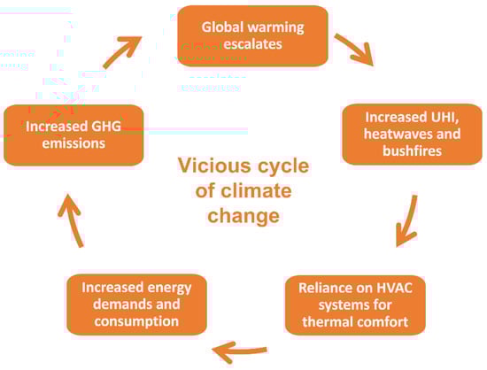 The combined threats of urbanization and climate change create pressures on maintaining human wellbeing and energy demands. Although the current technology using an HVAC system is capable of providing thermal comfort for an urban population, it is inevitable that users will generate GHG from this approach; this considerable amount of GHG contributes to climate change, which further speeds up global warming and creates the vicious cycle illustrated in Figure 1. An alternative sustainable solution is urgently needed for a safe and resilient living environment.