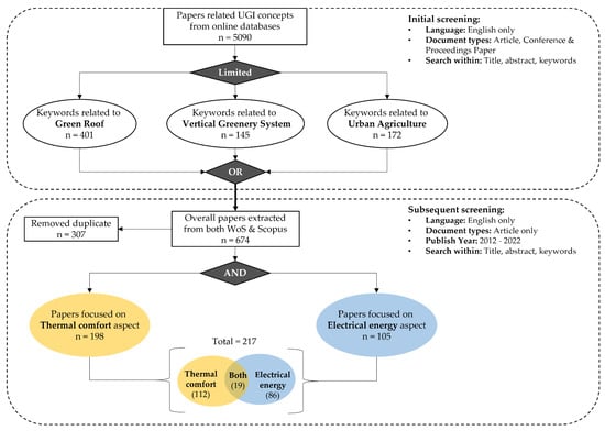 The subsequent screening specifies a research focus that is related to the thermal comfort or electricity energy aspects of the research; the typical keywords for each aspect and the exact searching codes used in Scopus and the WoS are provided in Appendix A. This screening stage was begun by narrowing down the three main UGI categories into two specified areas; a total number of 674 papers were extracted from Scopus and the WoS from the initial screening, while 307 duplicated papers across two platforms were removed. As a result, a total of 217 articles were reviewed (see Appendix B); of these, 112 articles focused on the thermal comfort aspect, 86 articles focused on electrical energy, and 19 articles investigated both aspects. Figure 2 illustrates the filtering and screening process of the articles.