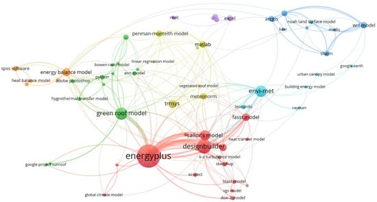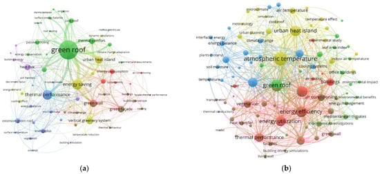 After the screening, a bibliography network was used to demonstrate the relationship between keywords and the link between topics. The bibliography network used the co-word analysis method on the VOS viewer [41]. A bibliography network is a technique that helps to examine the content of publications by organizing the author’s keywords, based on the frequency of the words that appear together, assuming that the words have a thematic relationship with each other [42]. Figure 3a on the left shows the strength of the link between keywords and was illustrated by the thickness. For example, the word “green roof” has the strongest link to “energy saving”, after which “cool roof”, “thermal performance”, and “urban heat island” appear. The phrases “vertical greenery system”, “green façade”, and “green wall” occurred equally often, with a similar strength of link.