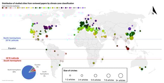 The world map illustrating the distribution of the studied cities in the reviewed papers, according to the updated Köppen-Geiger climate classification scheme in 2016 (see Appendix C for a detailed explanation of the Köppen-Geiger climate classification scheme) [46]. In this paper, the area above the 20° N latitude line is considered to be the northern hemisphere, while the area below the 20° S latitude line is considered to be the southern hemisphere; between the two is considered the equatorial region. Map edited using Datawrapper website. Available online: https://www.datawrapper.de/ (accessed on 7 May 2022).