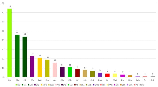 The distribution of Köppen-Geiger climate classification zones according to the studied locations. (See Appendix C for a detailed explanation of the Köppen-Geiger climate classification scheme).